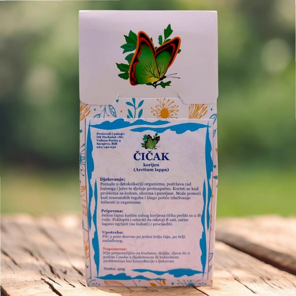 Korijen čička (Arctium lappa) je poznat po svom pročišćavajućem djelovanju na organizam, podržava rad jetre i bubrega, pomaže izlučivanje toksina i djeluje protuupalno. Tradicionalno se koristi kod problema s kožom, ekcema, psorijaze i reumatskih tegoba.